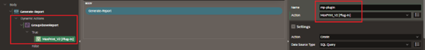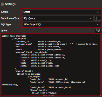 3. The “Create” Phase: Set the plugin action to Create, data source type to SQL Query and SQL Type as JSON Object SQL and paste your query in Query section.