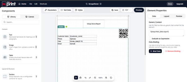 - The Section: Drag a Section element onto the canvas. This acts as the repeating container for each “Group.” Bind this section to your top-level data (the customer details).