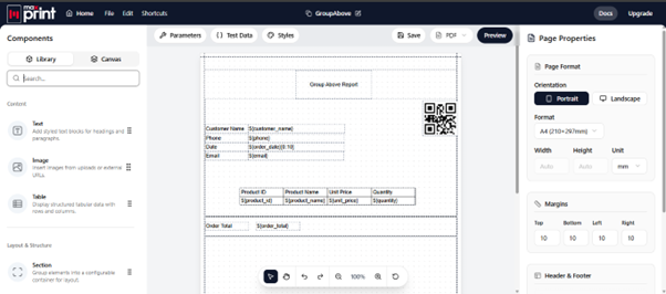 When you run the page and click that button, you’ll be whisked away to the MaxPrint Designer—a drag-and-drop environment that feels more like a creative suite than a coding IDE.