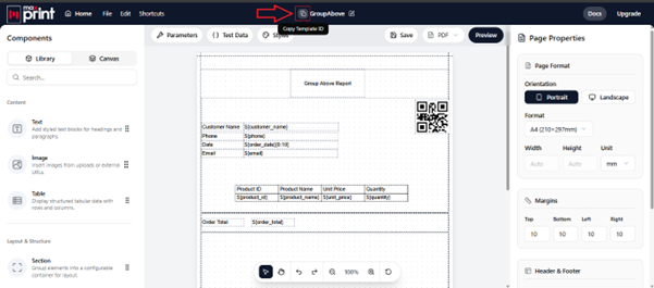 Once you’ve done your initial layout in the Designer, look for the Template ID next to the template name. Copy this ID. This is the “key” to your report.