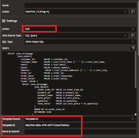 Every template you build in MaxPrint has a unique Template ID. Copy this ID. Back in Oracle APEX, update your Dynamic Action: